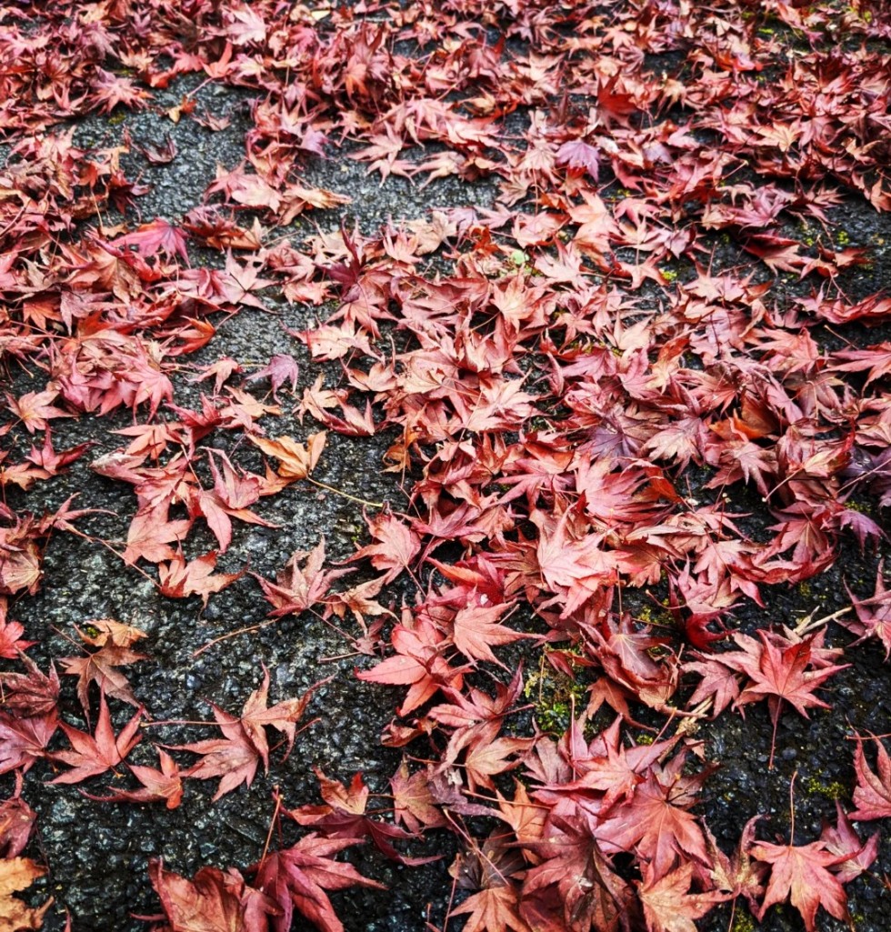 真っ赤なもみじが落ち葉のじゅうたんに…