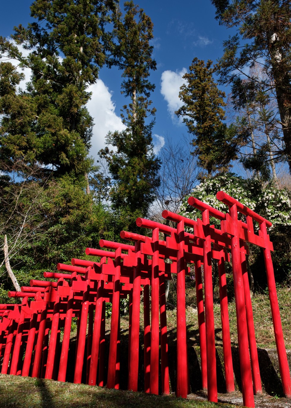 1列に並んだ赤い鳥居が前に向かって行進しているようです。