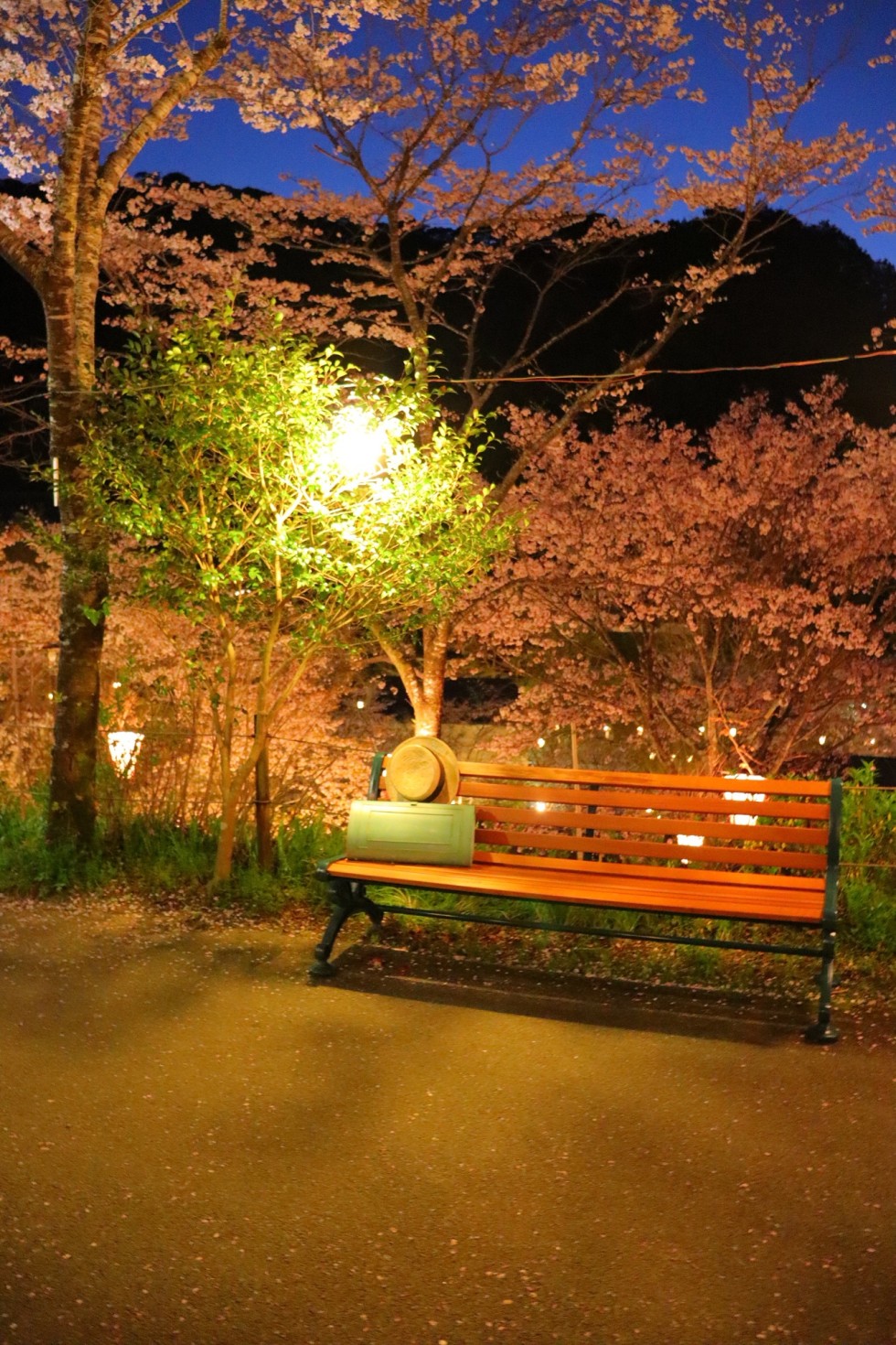 牧野博士が植物の研究に夢中になって自分の所持品をベンチに置き忘れしているという描写を写真で表現しました。夜桜が非常にきれいだったのでバックにしました。