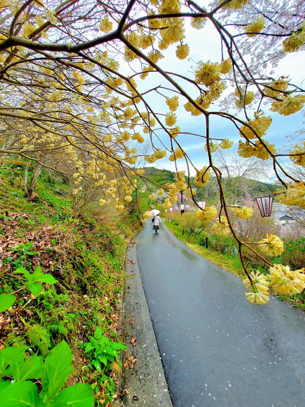 雨にしっとりとぬれながらも、道にせりだして花を咲かせアピールしているミツマタが印象的でした。